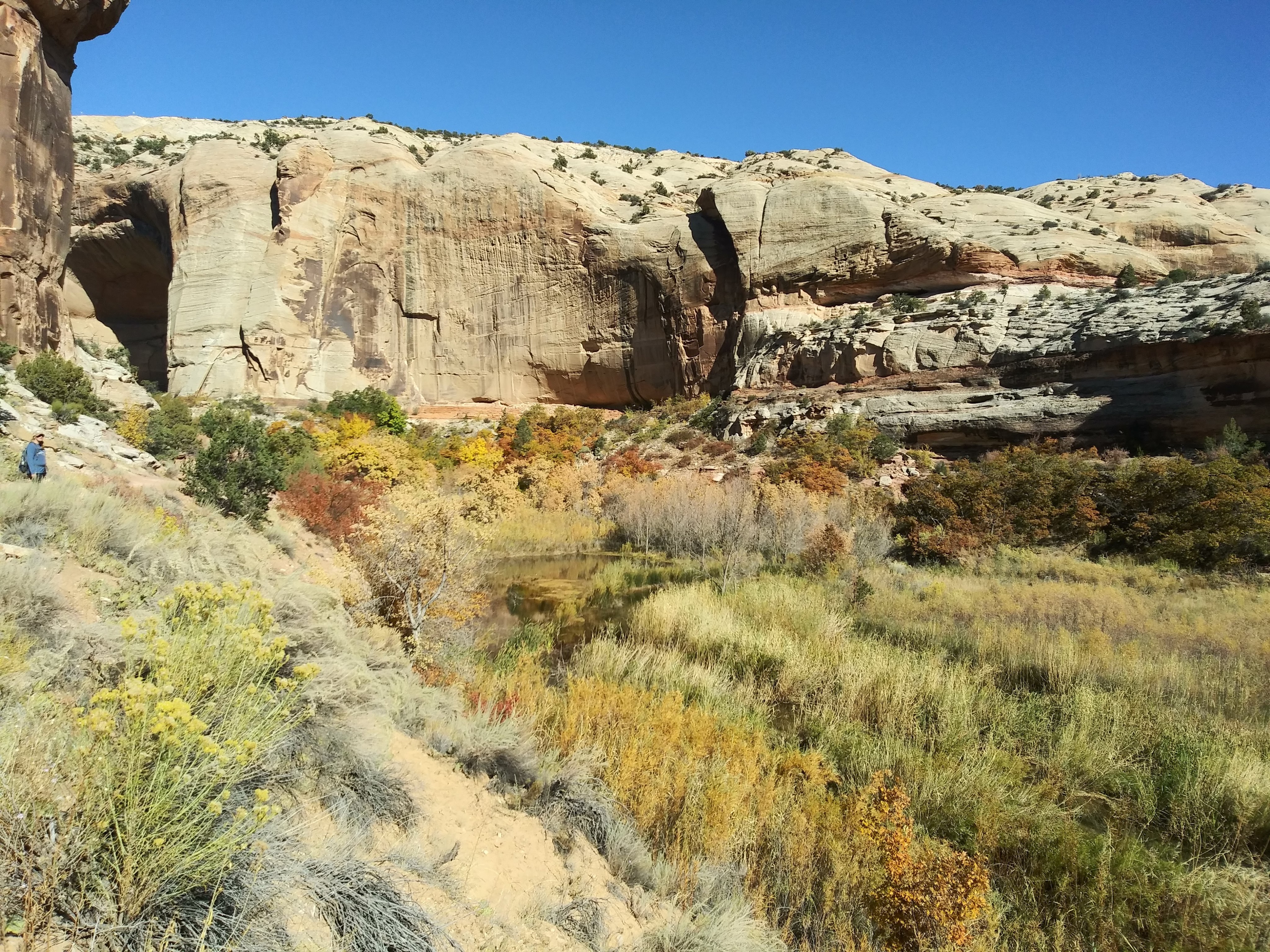 The creek begins as seeps and springs several miles up the canyon, but culminates in an amazing 126-foot spectacle that cascades down the cliffside and continues to flow year-round south towards the Escalante River.